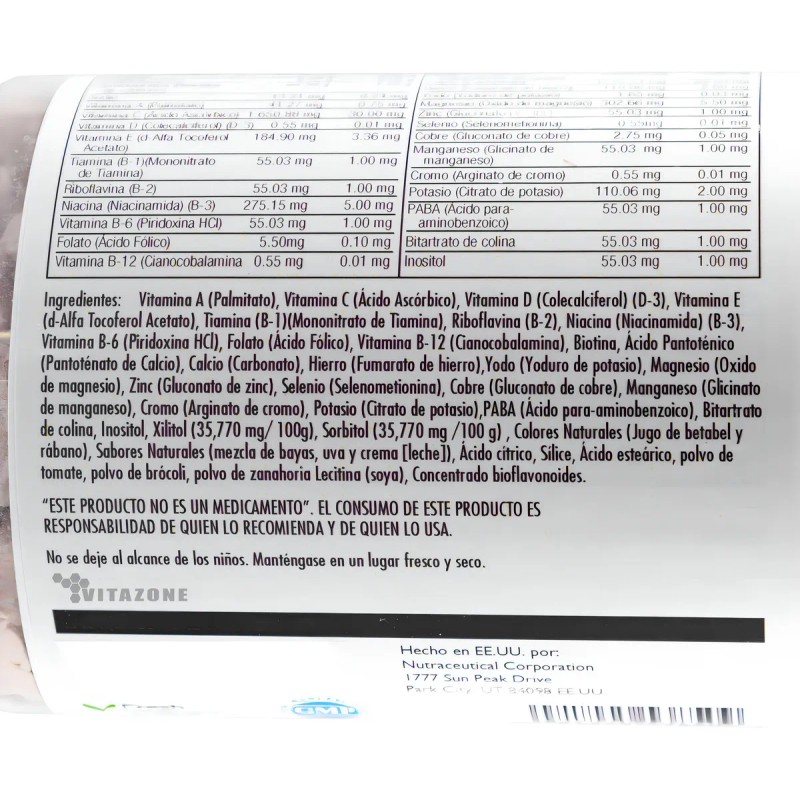 Multisaurus vitaminas para niños 90 tabletas masticables KAL es un suplemento alimenticio con formulación especial para niños mayores de 6 años. Contiene 22 vitaminas y minerales en tabletas masticables con forma de dinosaurios y sabor a mezcla de frutas del bosque. Utiliza colorantes naturales como jugo de betabel y rábano, y sabores naturales de mezcla de bayas y uva. Es libre de gluten y fructosa.