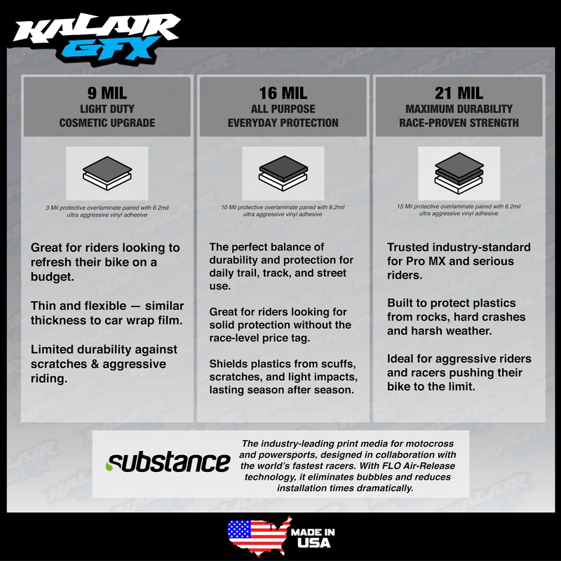 Market leading designs printed on triple layered vinyl with a glossy UV protective layer and ultra-aggressive adhesive specifically engineered for motocross and ATVs