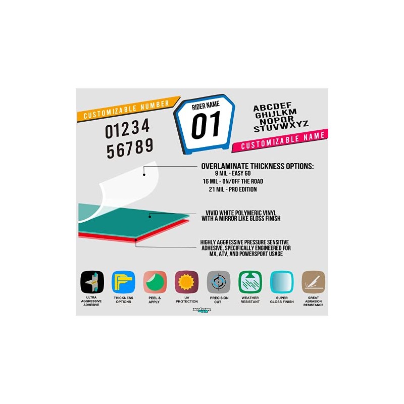 - Market leading designs printed on triple layered vinyl with a glossy UV protective layer and ultra-aggressive adhesive specifically engineered for motocross and ATVs
