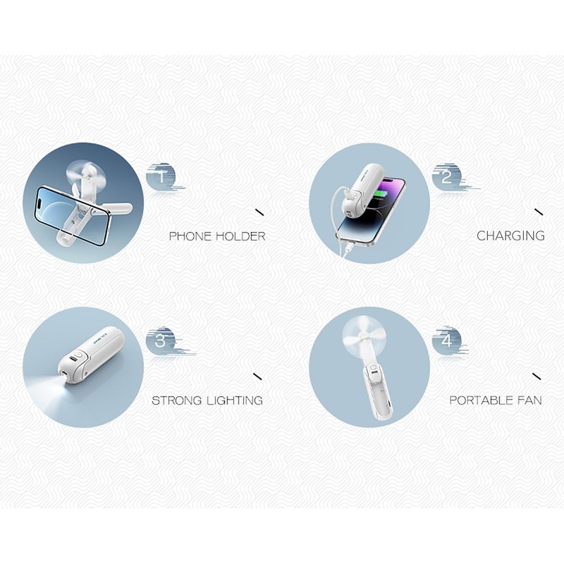 - Foldable phone stand: It can be turned into a desktop phone stand, while performing as a poortable desk fan.