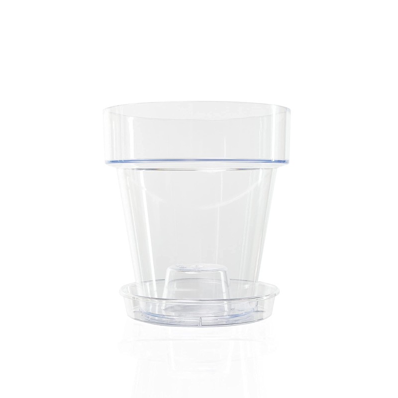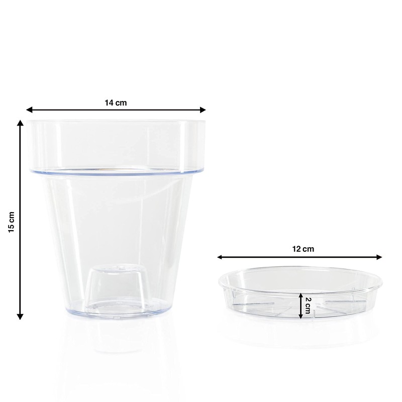 - Plastic pot with 4 drainage holes diameter 14 cm and transparent saucer diameter 12 cm - made of high quality plastic, with an ecological, non-toxic and recyclable material, very light and impact resistant
