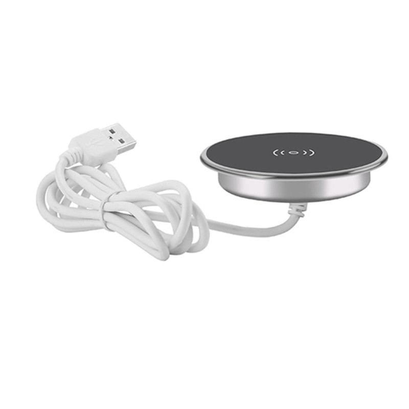 Experience charging your smartphone/tablet completely new with this innovative wireless fast charger. The charger can be installed in a piece of furniture of your choice. Only a hole with a diameter of 6 cm is required.