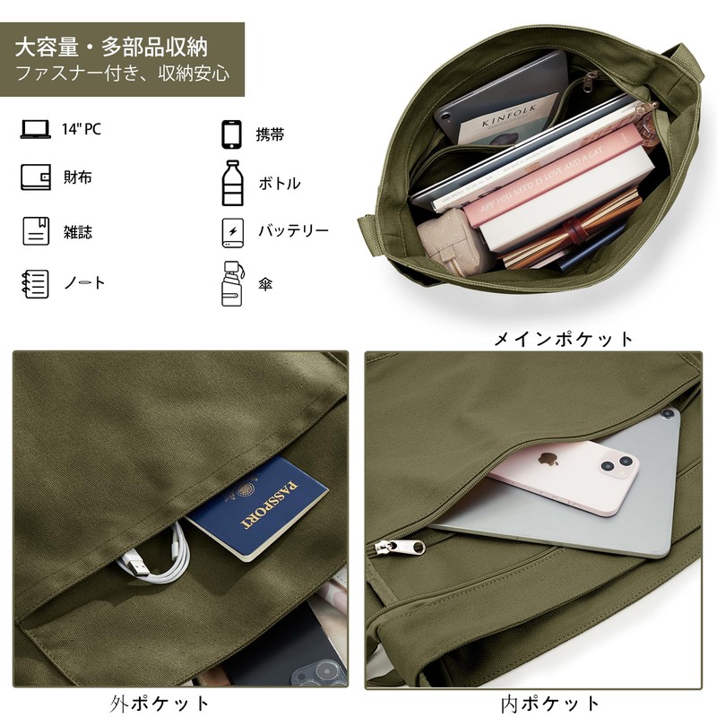 - Large Capacity: The space inside the shoulder bag is large, so you can easily insert and remove your items. Fits 14" laptop comfortably. Of course, your daily necessities. It has plenty of room for a change of clothes and cosmetics for a 23-day trip