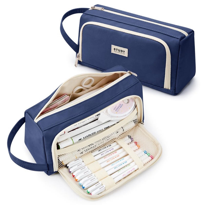 KALIDI Pencil Case 2 Compartments Extra Large Pencil Case School Aesthetic Pencil Case for Girls and Boys, Nylon Navy, Modern