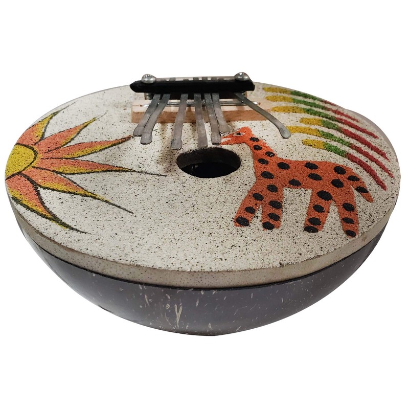 - [WHAT YOU GET] Giraff Design Sand Blasted Kalimba Coconut Shell Body Amplify the Sound From Vibrating Tines [SIZE] 5.5x3 inches [GENUINE HUMAN TOUCH] Each Drop Of Paint Is Dispensed Using A Home Made Dispenser - The Random Pattern Style Varies For Each Kalimba Which Is The Uniqueness Of This Thumb Piano - No Two Are Exactly Alike.
