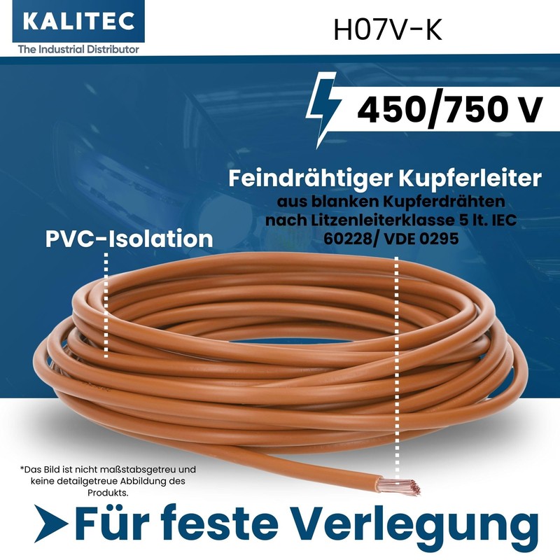 Kalitec 2 Metres H07V-K 10 mm² Brown Wiring Cable, Flexible Wire Cable, 10 mm² Wire, Fine-Strand Wiring, Single Cable, Meter Cabinet, Single Wire Cable for Control Cabinet