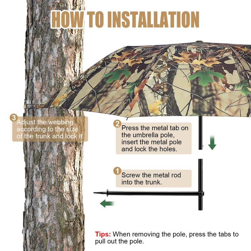 - Upgraded Heavy-Duty Metal RodSetup is effortlessrequiring no tools. Simply screw the tree umbrella for hunting into the tree for quick installation. The thickened rod body and deeper serrated tail design ensure sturdier and more convenient use, while being resistant to damage.