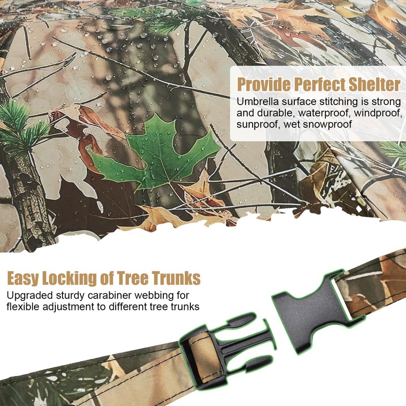- Well CraftsmanshipThe large hunting umbrella is made with premium stitching between the umbrellas to adequately block rain or wet snow. The umbrella bone structure is sturdy and not easy to rust, and the thickened fabric effectively prevents tearing. Keeps you dry all day in the tree stand.