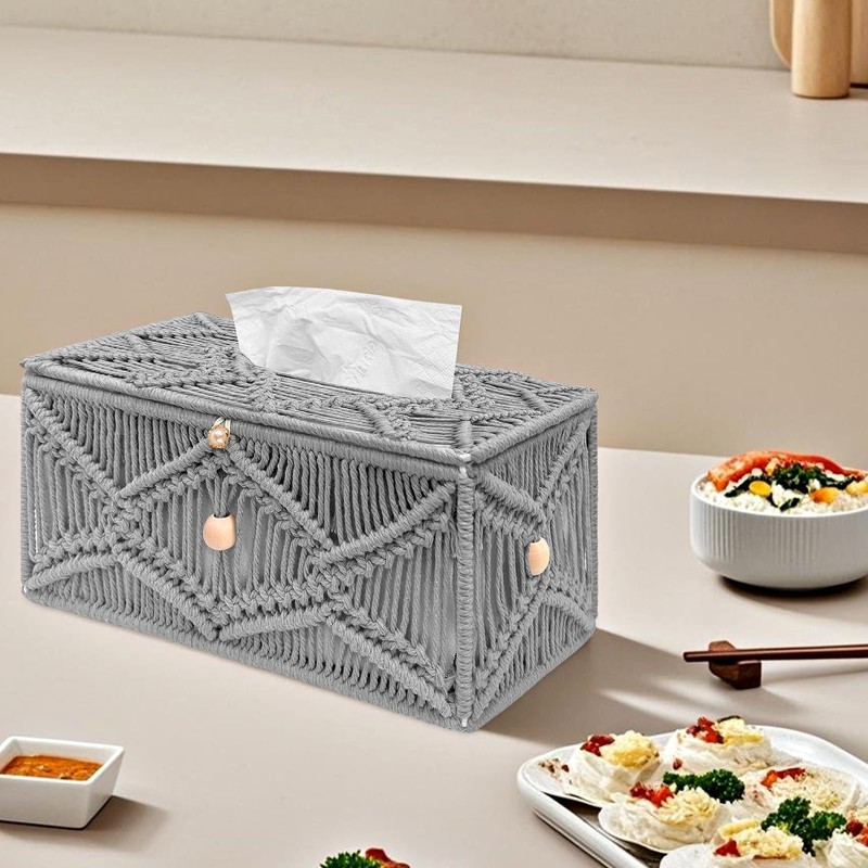 KaloKalo Handmade Tissue Box Cover Decorative Macrame Boho Rectangle Tissue Holder Cotton Rope Woven Napkin Facial Paper Organizer Bohemian Desk Storage Container with Buckle Wood Beads (Grey)