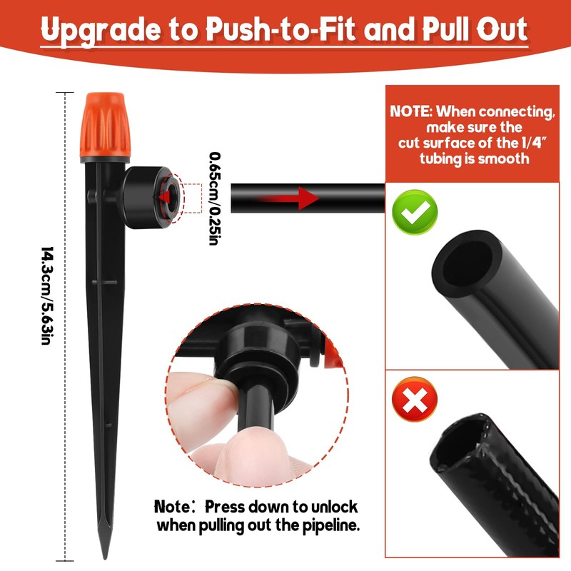 - Easy to Use: Push the 1/4 inch drip irrigation tube into the drip irrigation emitters connector,and insert the bottom of the dropper into the soil