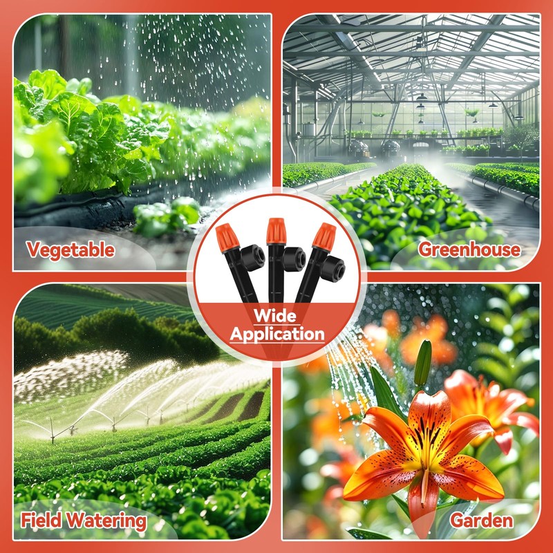 - Adjustable Drip lrrigation Misting Emitter: The water flow and spray diameter can be adjusted by rotating the top cap, and the drip cap can be removed for easy inspection and cleaning