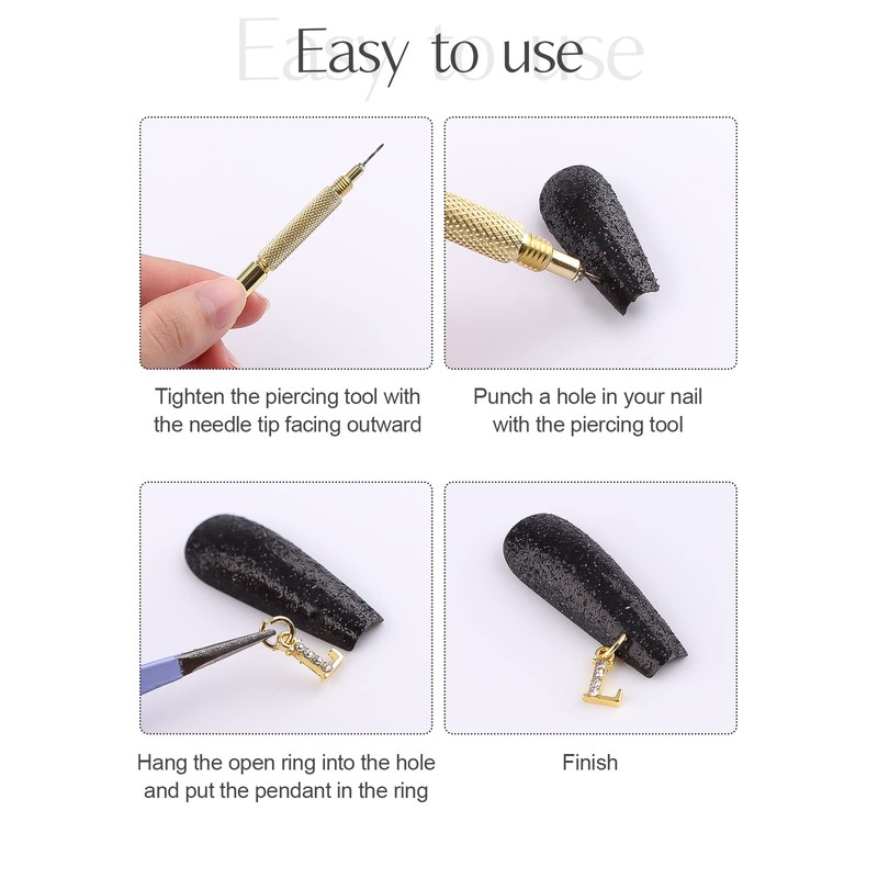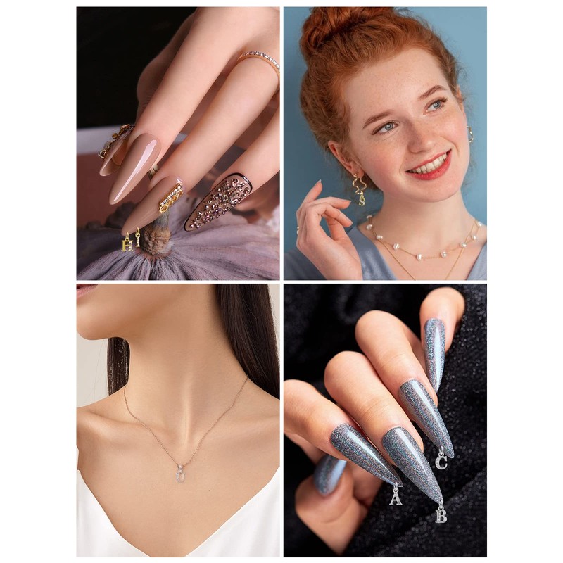 - El paquete incluye: recibirás 52 dijes de uñas de letras con anillos abiertos en color dorado y plateado (26 letras de la A a la Z), y 1 herramienta de perforación de uñas.