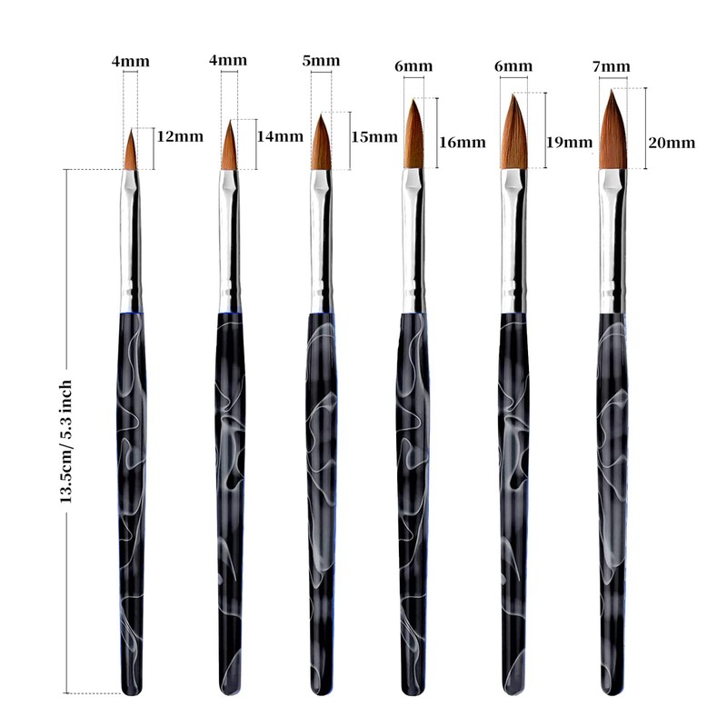 6 cepillos de uñas acrílicos con mango negro.