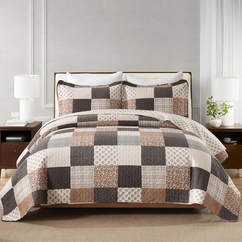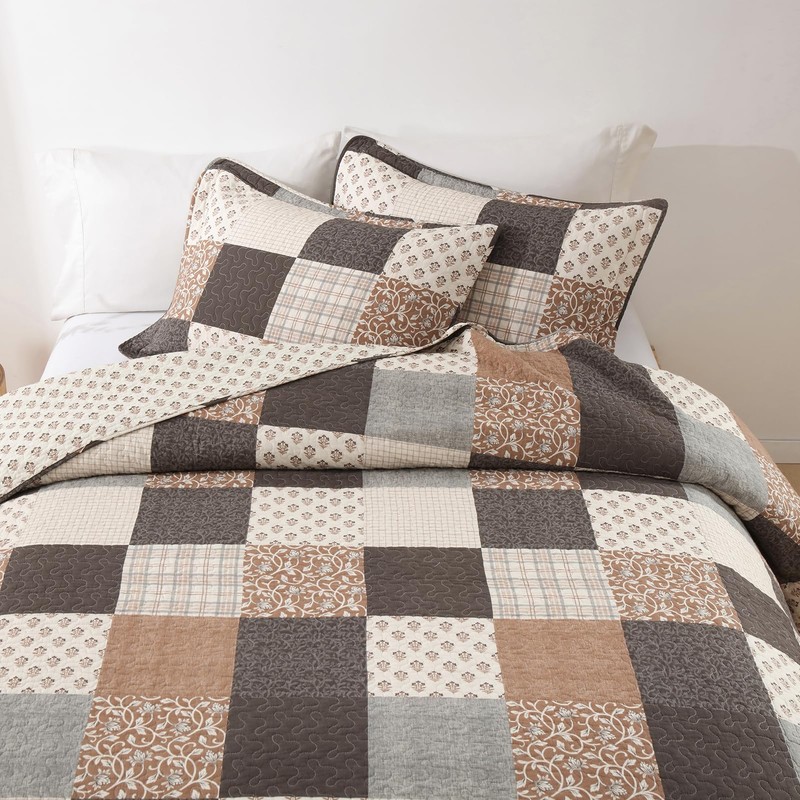 - ๐๐ฑ๐ช๐ฎ๐ข๐ฌ๐ข๐ญ๐ ๐๐จ๐๐๐ซ๐ง ๐๐๐ฌ๐ข๐ ๐ง: This reversible quilt set offers two distinct styles in one: Side A features a vintage-inspired of muted earth-toned checks, solids, and mini florals for rustic charm, while Side B presents a clean solid base with orderly stamped motifs for minimalist elegance. The versatile muted palette effortlessly complements farmhouse, modern, and eclectic decor styles