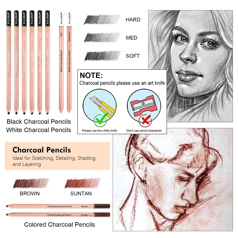 - Complete Charcoal Drawing Set: Our charcoal drawing supplies include 6 black charcoal pencils (soft, medium, hard), 2 white charcoal pencils, 2 colored charcoal pencils, 2 willow charcoal pencils, 3 charcoal sticks, 2 willow sticks, 1 artist knife, 1 vinyl eraser, 1 kneaded eraser, 1 dual-tip applicator, and 1 paper blending stump. This charcoal drawing set ensures you have all the essential tools.