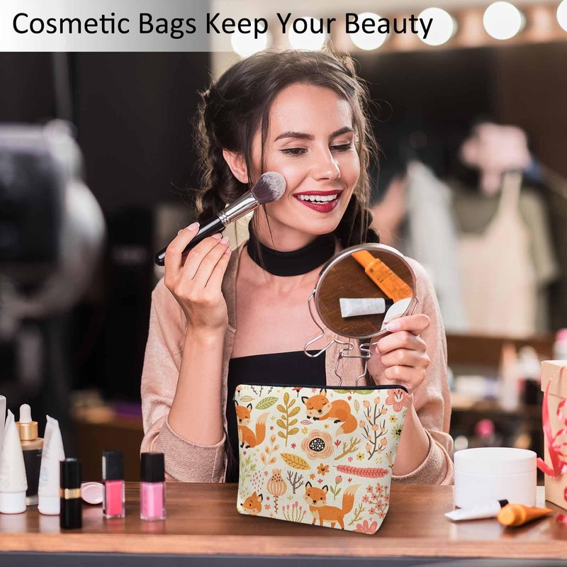 Kalygon Women Makeup Organizer Bag Fox Forest Animal Cute Fox Orange Flax Cosmetic Bag Makeup Bags Toiletry Bag Accessories Organizer Travel Bags For Home Bathroom Office Hotel Gym