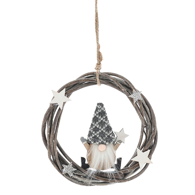 - Set of 2 hanging wicker wreath with gnome sitting made of wood - very detailed design - size approx. 15 x 15 cm with ribbon for hanging approx. 15 cm long - really fun decoration for any season