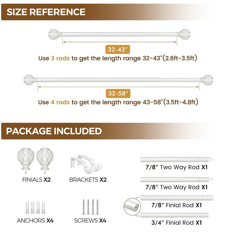 - EASY MOUNTING: This white curtain rods set packed with 4 pcs rods, 2 finials, 2 pcs brackets, mounting hardware and installation instruction. You can easily mount these telescoping curtain rods on the wall. Completing your stylish home decor with no efforts. Please check our images for exact package contents