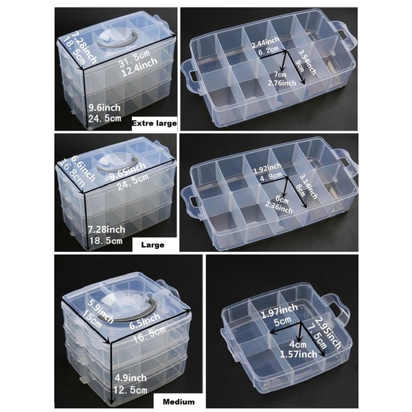Note: This organizers have 3 sizes, size and weight reference to product photos. items are irregular shape and measured by hand, the size of the actual item you received could be slightly different from the size above. Please be reminded that due to lighting effects, monitor's brightness / contrast settings etc, there could be some slight differences in the color tone of the pictures and the actual item. Description: 1.This awesome snap cube organizer is made out of transparent plastic which makes locating your items easier. 2.This storage cube has 3 tiers that each lock together with a latch on each end. The boxes are made up of several well-made customizable dividers that slide in and out of little channels, which is so convenient and perfect for making it work with whatever items you choose to store in it. 3.The lid has a carrying handle for easy transporting,it can be removed from one set and you can add more sections by simply snapping them together. 4.It is a versatile nifty organizer. And is helpful all over the house and is constructed well. This bin is easy to use and modify to each item's space requirements. 5.It's perfect for little arts and crafts items but can't hold heavy items Suit for toys, Desktop stationery, Jewelry Accessory , Drawer, Kitchen supplies, bobbins, ribbons, ephemera, straight pins, needle, buttons, sewing supplies and so on.