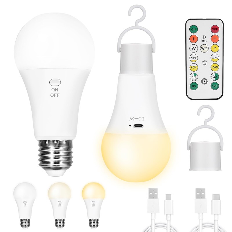 Kambo E27 LED Glühbirne, Wiederaufladbarer Akku 2600mAh mit Fernbedienung, 7W dimmbare Lampe mit Timing-Funktion, 3 Farbtemperaturen, Leuchtquelle für stromlose Umgebungen, Outdoor Camping, 2 Stück