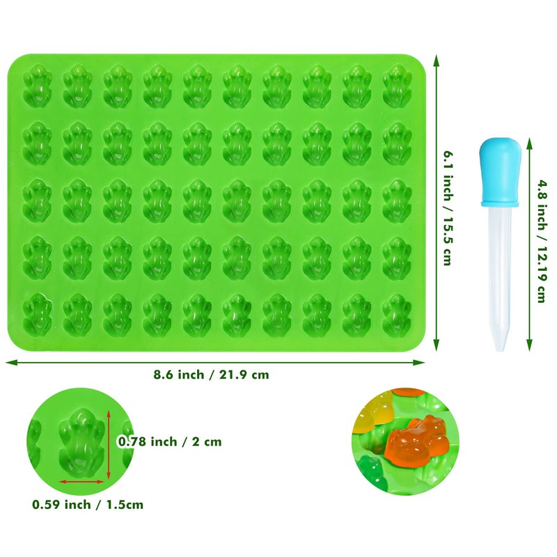 - SIZE & CAPACITY: Each silicone gummy frog mold measures is 8.6"x6.1"x0.35"; Each frog measures 0.59 x 0.78 inch. Each frog cavity: 1.5ml. 50 cavities per tray. Total 150 cavities.