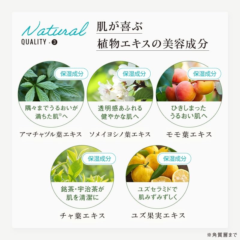 - 🌿植物エキスの美容成分 5種の植物エキスが肌のうるおいをサポート。 肌が本来持っている保湿機能に着目し、使い続けることでうるおい肌にアプローチ。 透明感あふれる健やかな肌へ導きます。[◆アマチャヅル葉エキス◆ソメイヨシノ葉エキス◆モモ葉エキス ◆チャ葉エキス◆ユズ果実エキス]