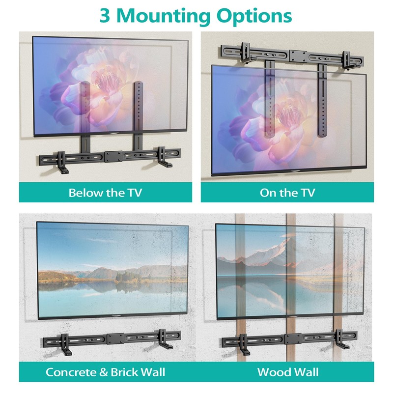 - [2 Mounting Options: Above or Below the TV]: The KAMIWI soundbar bracket can be mounted above or below the TV, and it is compatible with a wide range of TV wall mounts, including fixed, tilting, full-motion, articulating and interactive. The KAMIWI soundbar mount will not only make your TV look more designed but also save space in your living room.