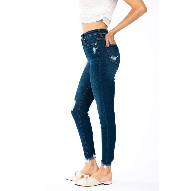 - Vaqueros delgados ligeramente desgastados con dobladillo deshilachado en el tobillo de Kan Can