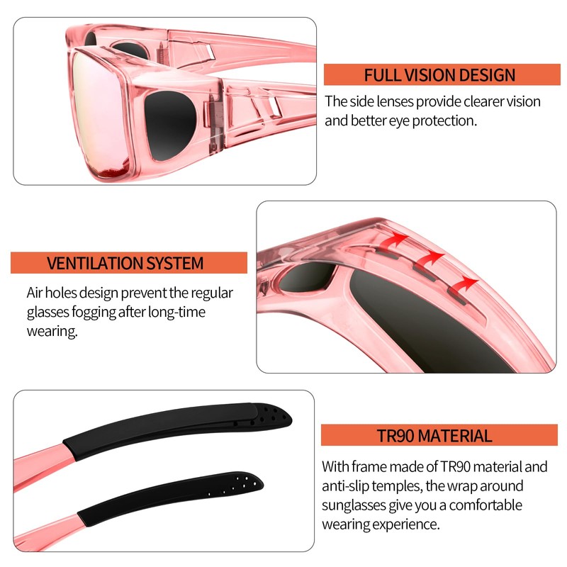 - Usage Scenario: The KANASTAL pink over-glasses sunglasses can be comfortably worn over clear eyewear or directly, making them suitable for year-round, all-day wear. Ideal for travel, driving, sunbathing, or sensitive eyes, they offer 360-degree protection against sunlight, wind, sand, and water.