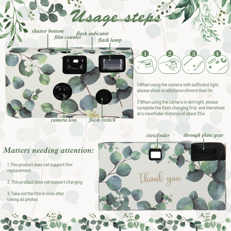 - Elegant and Stylish: this disposable camera for wedding features a romantic eucalyptus leaves pattern design, which is both exquisite and full of charm; The classic camera appearance blends vintage and modern styles, making it ideal for anniversary celebrations or wedding parties; It will add a warm atmosphere to your event, and using this camera will make you stand out in the crowd
