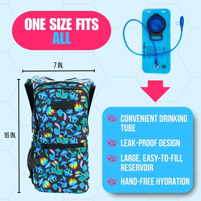 Kandies World Reflective Festival Hydration Pack - 2L Water Bladder for Raves, Hiking, Biking, Running, and More (Multi-Pocket Design) (Mushroom)