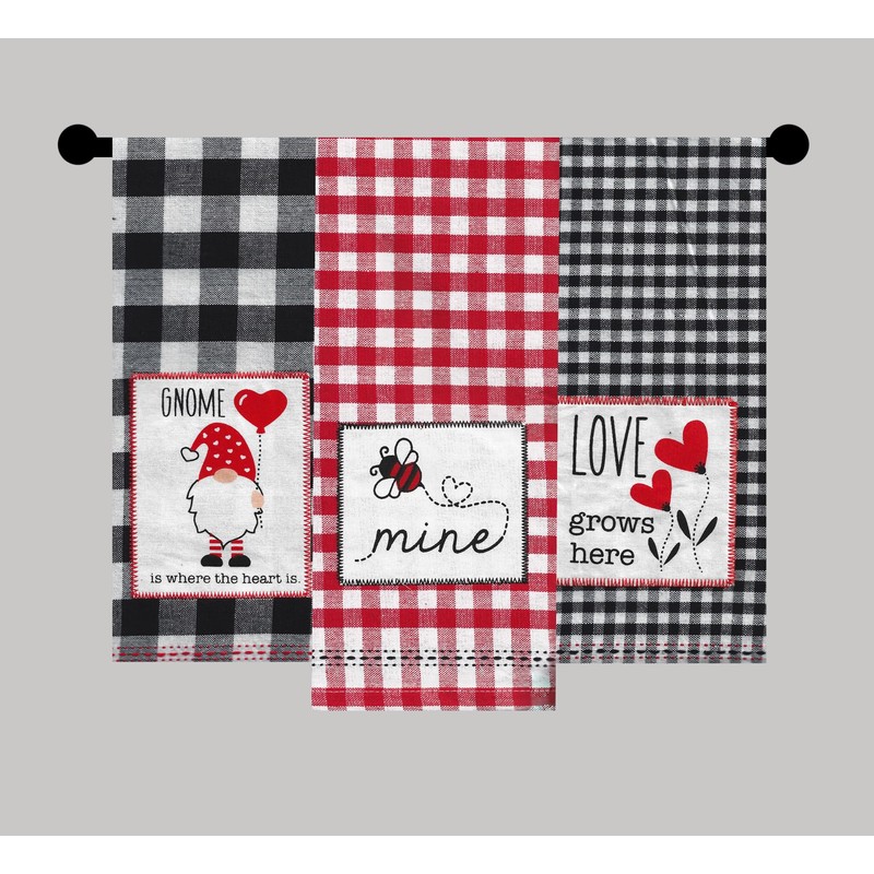 - DECORATIVE and FUN PATTERN: The embroidered towels coordinate with your kitchen decor and create a cute decoration while being useful. A black and white checked towel is decorated with an embroidered patch with Love grows here; a red and white check towel is decorated with an embroidered patch that shows a Bee Mine; and a black and white buffalo plaid is decorated with a cute little gnome with the saying Gnome is where the heart is.