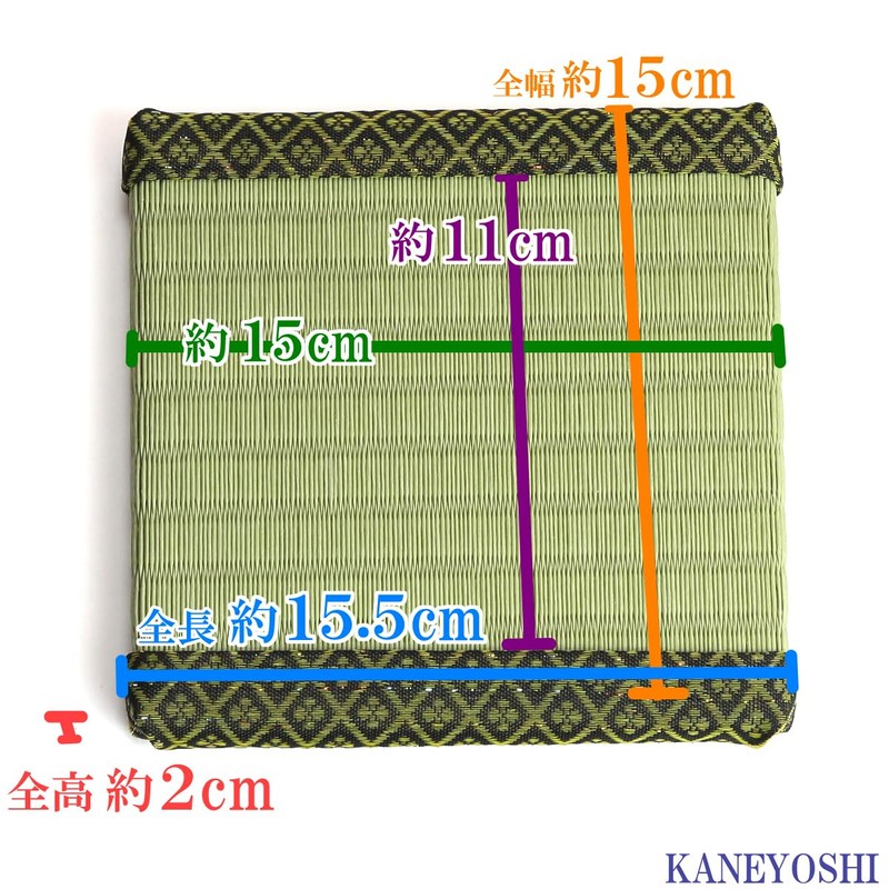 - Overall Width: Approx. 6.1 inches (15.5 cm); Width: Tatami mat only: Approx. 5.9 inches (15 cm); Overall Height: Approx. 5.9 inches (15 cm); Tatami mat height: Approx. 4.3 inches (11 cm); Height: Approx. 0.8 inches (2 cm)