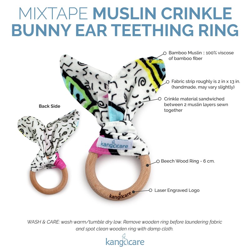 Kanga Care Baby Soft Muslin Sensory Crinkle Bunny Ear Wood Teething Ring - Radical 80's