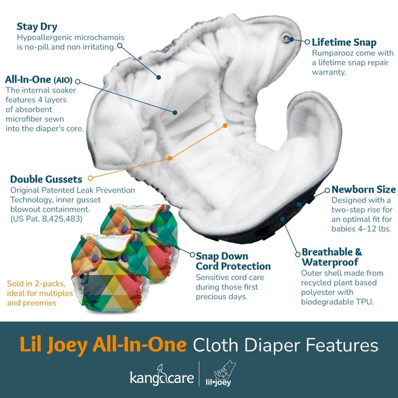The Kanga Care Lil Joey is a newborn diaper designed to fit from approximately 4-12lbs featuring the patented double inner gusset leak protection design, exclusive to Kanga Care brand diapers. The inside of each diaper is designed with two gentle inner gussets, a double barrier that protects against accidents. The Kanga Care Lil Joey also features a snap down front for sensitive cord care during those first precious days. The simplest of cloth diaper systems on the market, the Kanga Care Lil Joey is an All in One diaper with the core consisting of four absorbent layers of microfiber while a soft and gentle microchamois inner keeps babies new skin fresh and clean. The Kanga Care Lil Joey exterior is a waterproof polyester TPU (thermoplastic polyurethane) that comes in a variety of fun colors and fashionable prints.