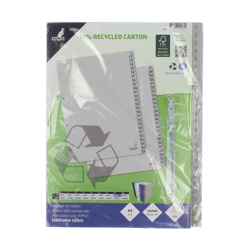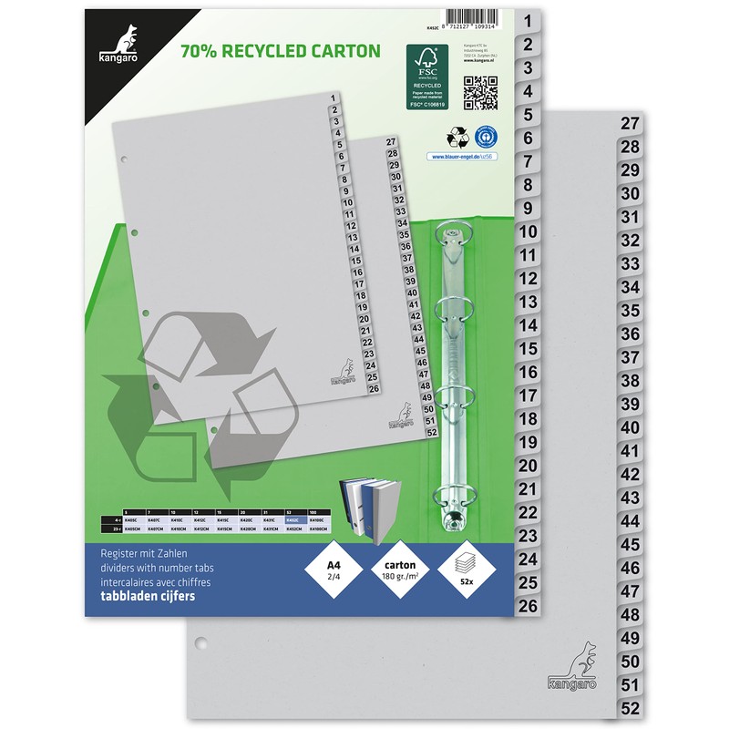• Kangaro Cardboard index DIN A4 numbers 1-52. 180 g/m² recycled grey FSC cardboard - 52 pieces