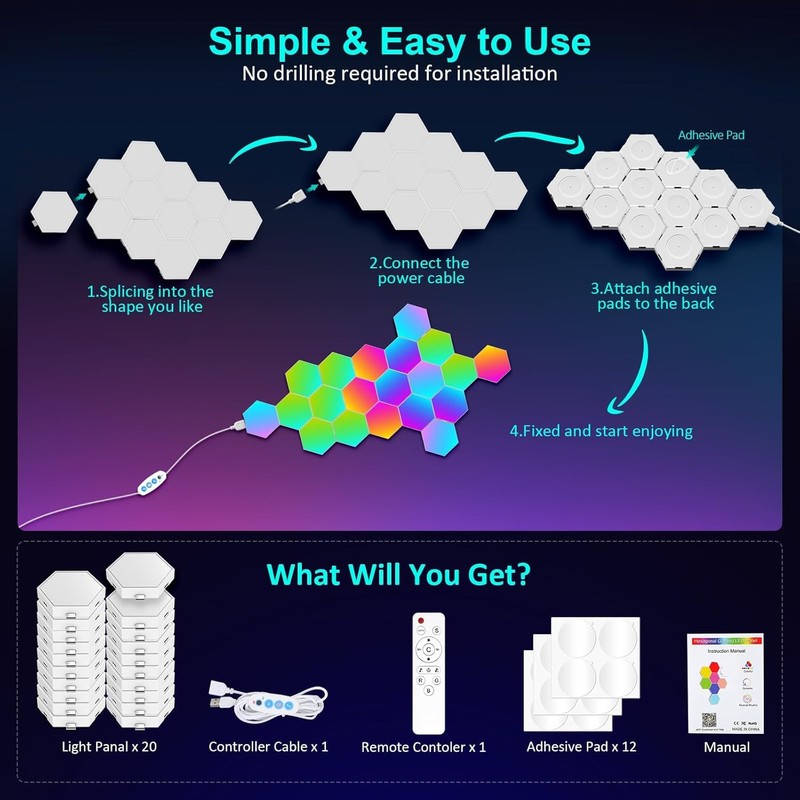 - 【MODULAR DIY DESIGN & EASY INSTALLATION】 - Unleash your creativity effortlessly! This 8-pack set includes interlocking hexagonal panels to assemble into countless shapes (honeycomb, wave, etc.). Fasten them securely to any wall with the strong adhesive pads. Just connect to a standard 5V/2A USB port (like a power bank, laptop, or adapter) and your personalized wall decor is complete!