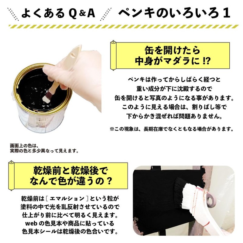 • [Precautions when painting] *Please read the precautions in the product description carefully before using. ■[Stir well before using] The pigment is submerged to the bottom, so be sure to stir every corner of the can thoroughly before use. ■[About painting area/ drying time] The painting area, drying time may vary slightly depending on weather conditions, the material being painted, and how to apply and how to dilute. ■[Humidity/Weather when painting] Please do not apply in temperatures below 11°F (5°C), rainy or high humidity (85% or higher) in windy days. During the condensation season, please finish the coating by around 3 pm. ■ [Remove moisture from painting] If the painted surface is painted or wet, it will slow dry and cause paint film abnormalities. ■ [Do not apply thick at one time] Do not apply thick at a time. ■ [Test application on an inconspicuous area] Before production, test application on an inconspicuous area to confirm color and finish. ■ Please do not allow water and steam for more than 1 day after painting. ■ [For glossy or unpainted] Please use sandpaper to rough the surface with glossy paint film, or unpainted iron