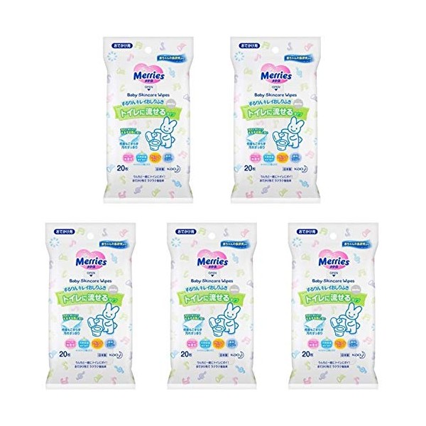 Kao Merries Clean Flushable Wipes for Going Out, 20 Sheets x 5 Set