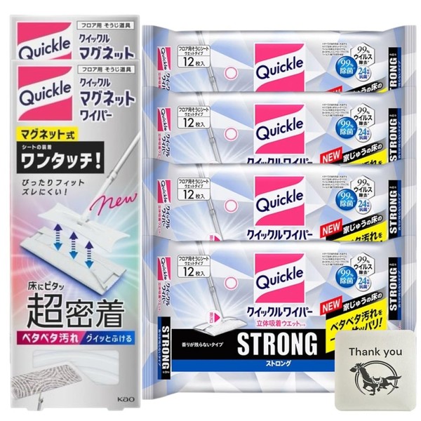 Kao Quickle Magnetic Wiper Floor Cleaning Tool, 2 Pieces + Quickle Wiper 3D Suction Wet Sheet, Strong, 12 Pieces, Set of 4 + Kunutonn Original Logo e-Bonus