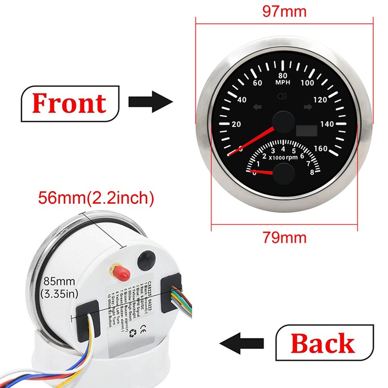 - Installation:85mm (3 3/8") hole in the panel and allow a clearance of 55mm (2 3/16”) behind the panel to fit the gauge. Indicating range: 0-160MPH.