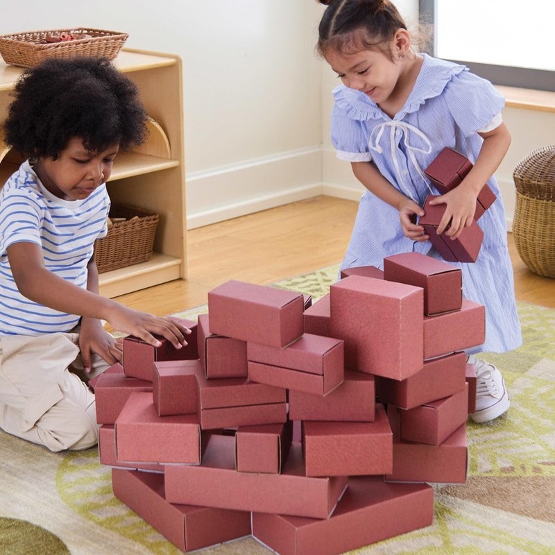 - Cardboard blocks features a gradiated color scheme reminiscent of authentic bricks