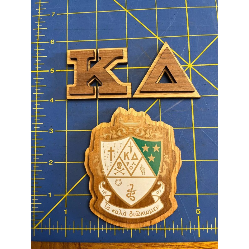 - You will receive 3.5" wood crest with decal and 1.5" Greek wood letters