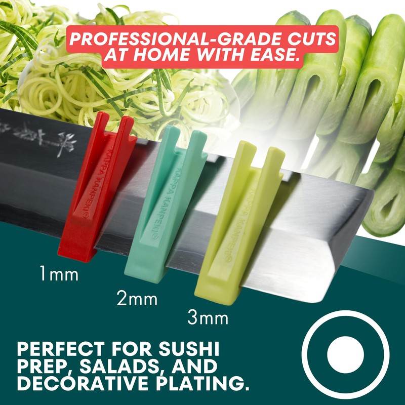 - VERSATILE & ADJUSTABLE SLICING OPTIONS: It offers unmatched versatility with its three distinct sizes. The 1mm version in stunning otoro is perfect for ultra-thin slicing, ideal for cucumber slicer thin applications and creating beautiful tsuma. The 2mm version comes in sleek kyuri and excels at fine julienne tasks, making it an excellent sushi cutter. The 3mm comes in vibrant wasabi and is perfect for thicker slices, giving you the flexibility to tackle a variety of vegetables with precision.
