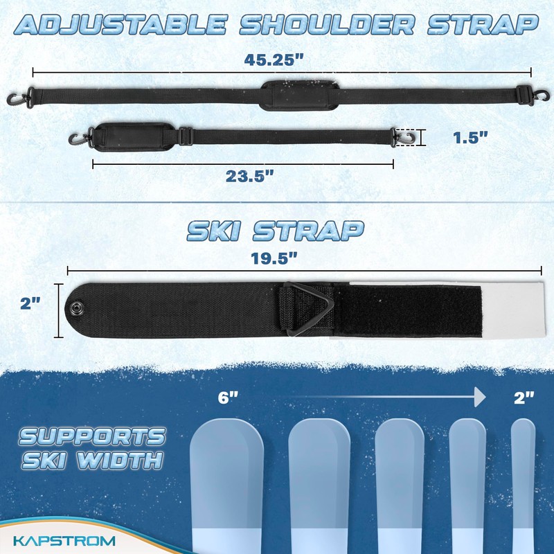 - SIZE ADJUSTMENT - Strap length can be easily adjusted between 23” - 45” as per convenience; Hook & loop closure ensures you can easily fit ski boards from 2” - 6” width
