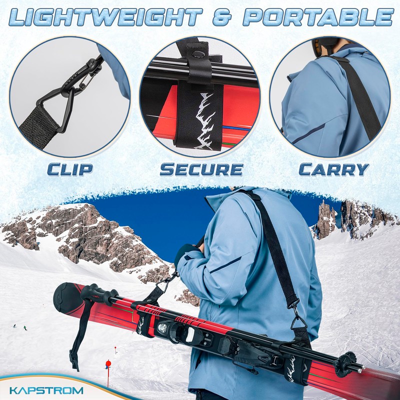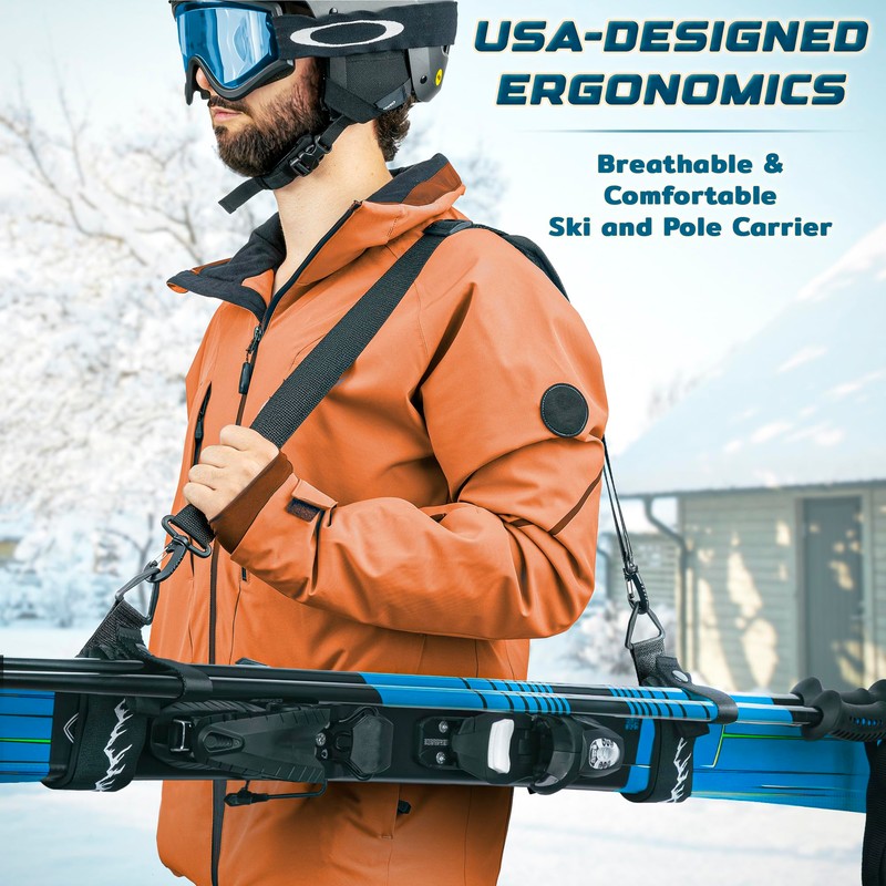- USER-FRIENDLY - Simply, slide skis and poles into slots; Secure using hook and loop fastener; Attach shoulder strap to small straps using clips; Adjust the length and your gear is ready for carrying; 6-Piece set includes 2 shoulder straps & 4 pole straps