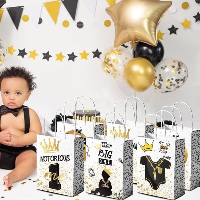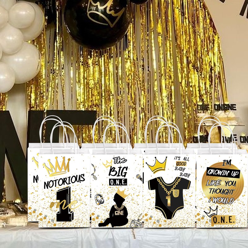 KARAQY 16 Pcs Notorious One Gift Bags with Handle, Black Gold Hip Hop Theme Goodie Treat Party Favor Bags for 1st Birthday Party