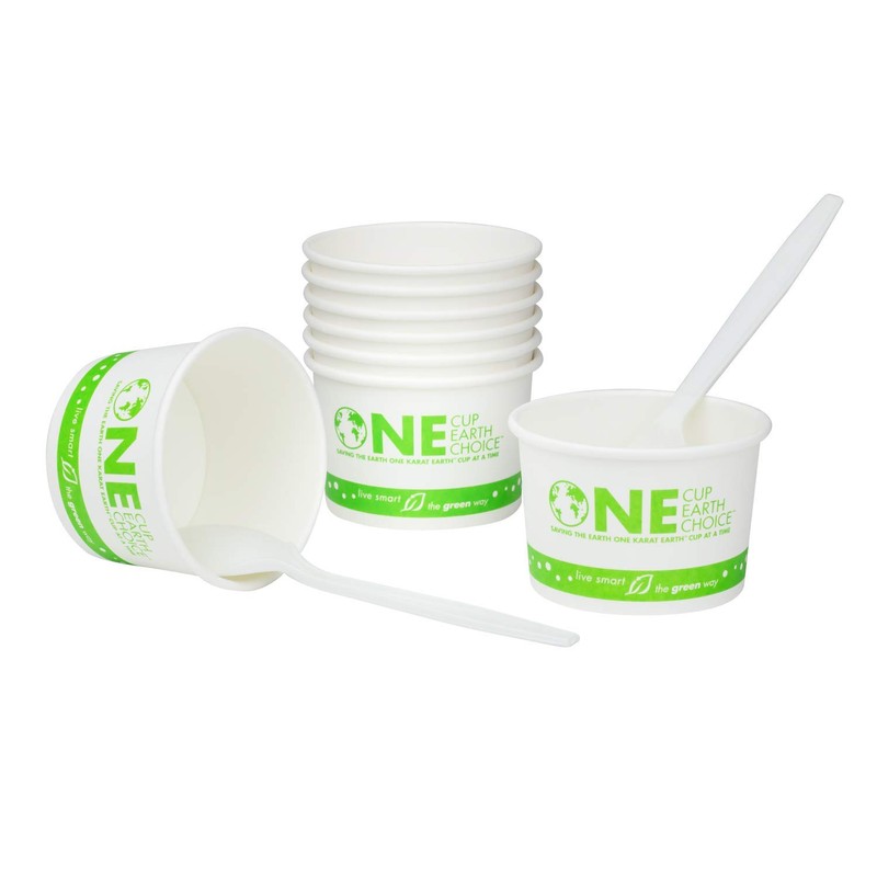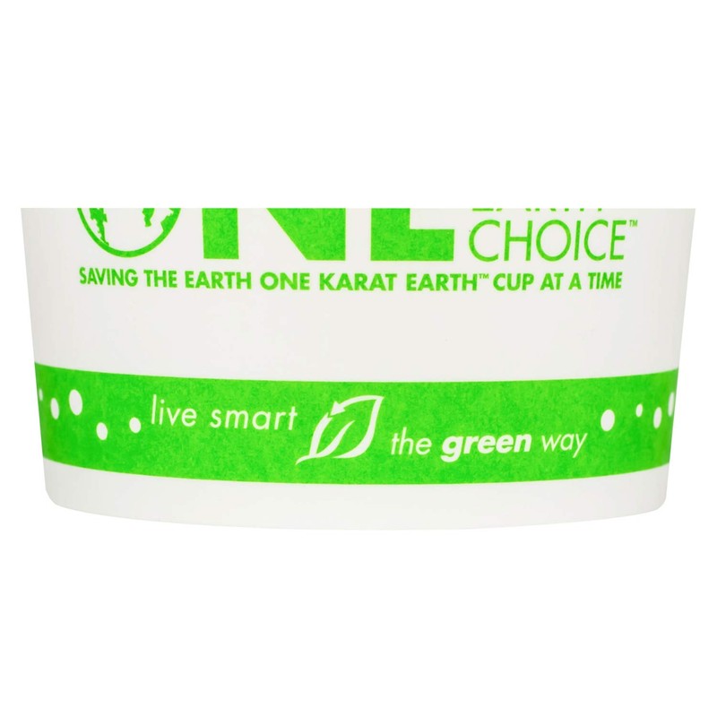 Karat Earth food containers are made from renewable resources and feature an interior PLA lining, which is made from the starch of corn, sugarcane, cassava, or beetroot plant. They are designed to be used with hot or cold foods from ice cream to side dishes, and come in multiple sizes to meet your foodservice needs. Choose white or the Generic Print with the slogan, “one cup, one earth, one choice.”.