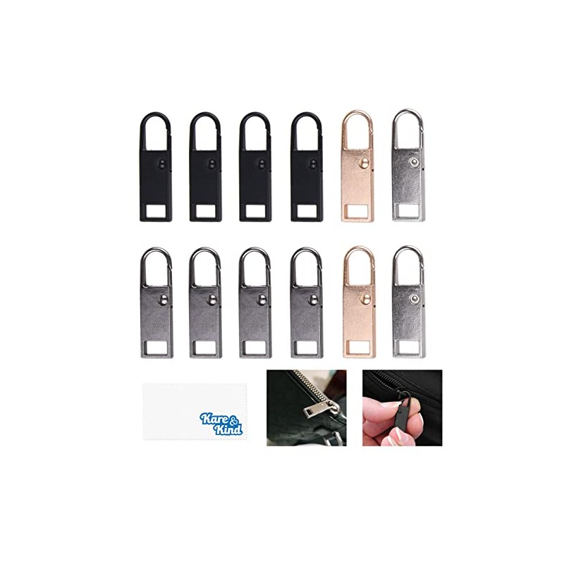 - 12 x zips: a simple device to complement any zip and easily close garments. Replace the existing puller with this type to make it longer. The pack contains 12 x zip pullers (4 x black, 4 x gun black, 2 x silver, 2 x gold)