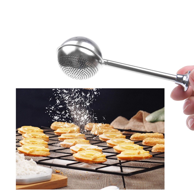 - EASY TO HANDLE AND USE >> The spring-operated handle is easy to control and allows light to heavy dusting. To open the shaker, simply press the handle a few times. One side of the sieve ball is solid and serves as a scooper while the other side has perforated holes that allow neat and even distribution.